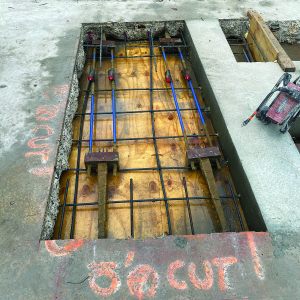 One of the most complex challenges involved demolishing the original building core. This required de-tensioning and re-anchoring 18 post-tensioning tendons. Because the existing button head post-tensioning system was outdated, custom conversion blocks were designed to adapt it to modern anchoring methods.