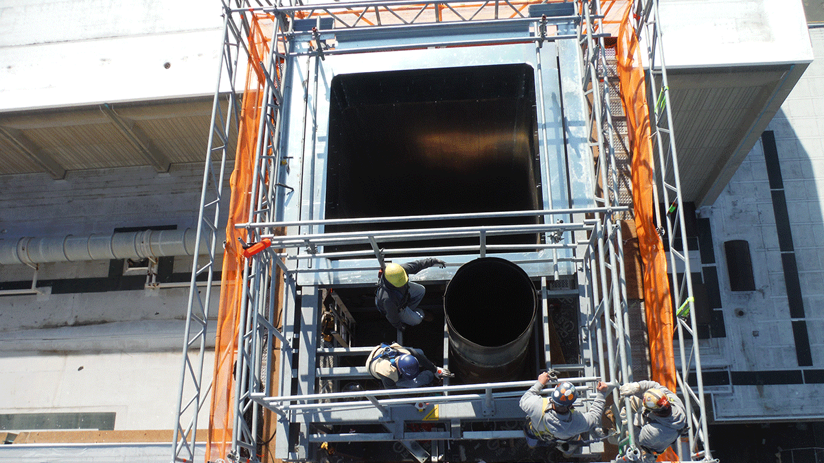 This configuration allowed construction of the system scaffold to be performed on the ground instead of up in the air. A swing stage was used as an elevator to reach the scaffold on the roof and a manbasket hoisted via crane was used at the start of the project to setup the knee brace supports on the stack.