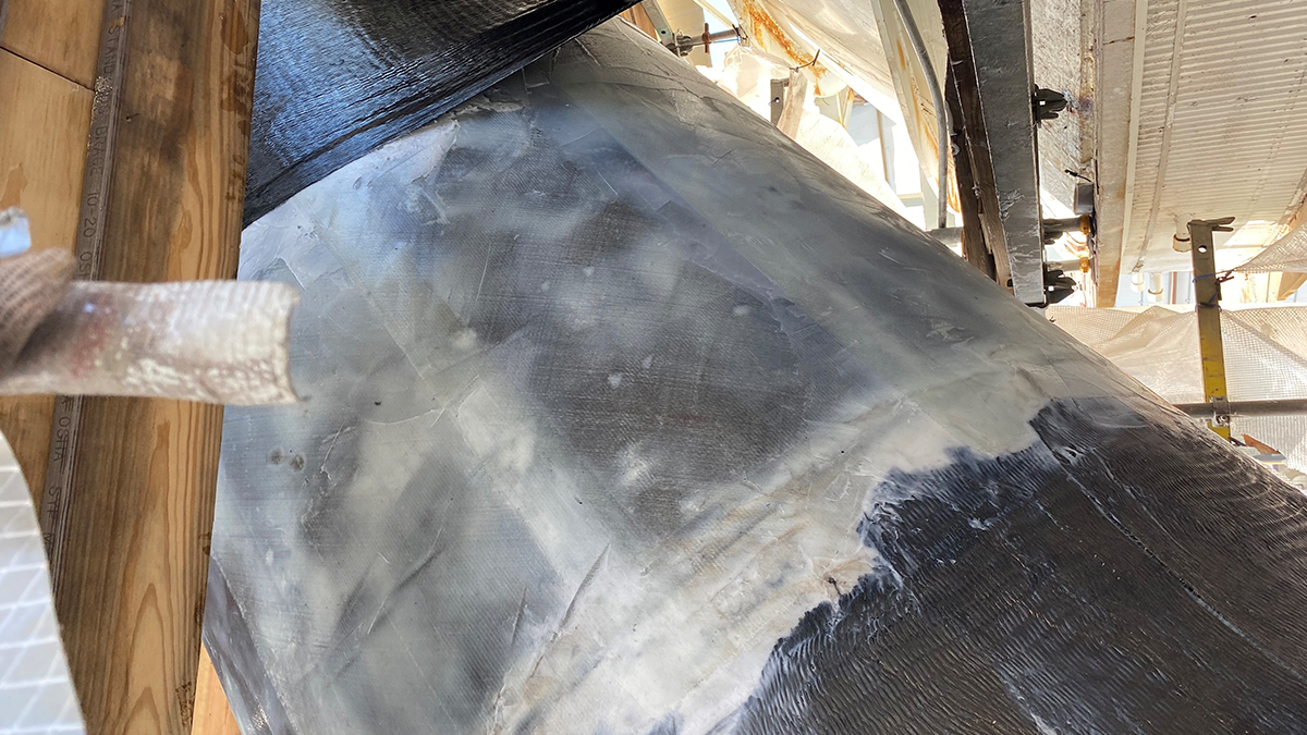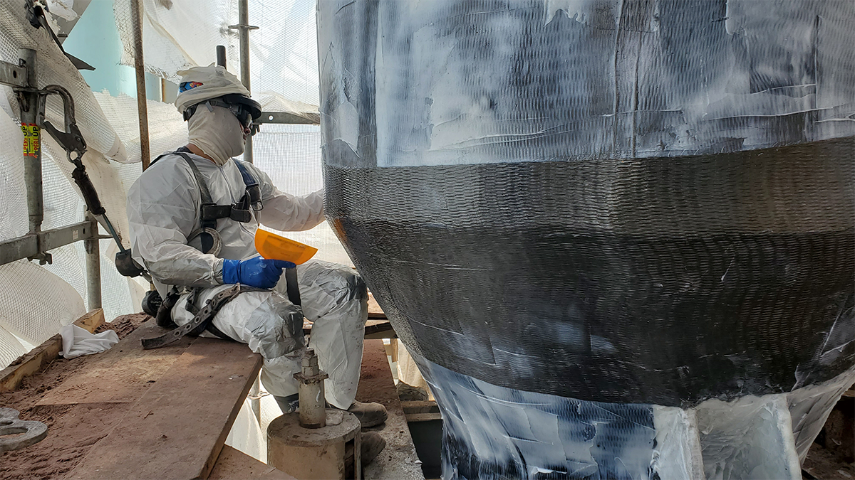 STRUCTURAL was hired to perform the repairs. The pipe surfaces were cleaned and primed with epoxy. One layer of fiberglass was then installed as a dielectric barrier. Using STRUCTURAL TECHNOLOGIES’ StrongPIPE® V-Wrap™ Carbon Fiber System, the team wrapped the pipe with five layers. Repairs were performed while the unit was online and the solution provided long-term strengthening to the pipe.