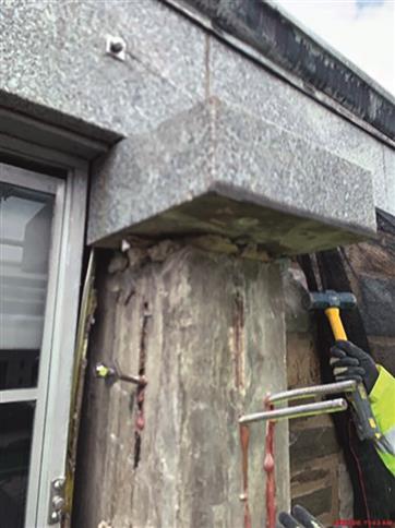 The original building envelope was designed as a barrier wall with no drain cavity or working flashing system. The structure’s exterior wall cladding is composed of large granite panels independently supported by metal components and anchors.