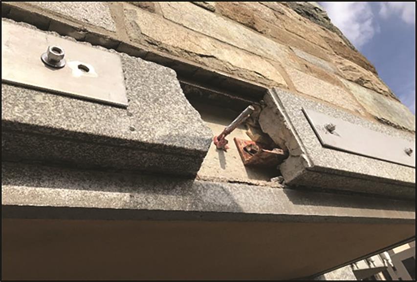 Using sledgehammers, crews demolished 708 pieces of granite approximately 81 tons. However, during demolition, the team discovered differing site dimensions. To address the newly discovered conditions, STRUCTURAL phased the back-up wall repairs. The team utilized an anchorage system, a hand-set method in which each stone is individually attached to the building’s primary structure as opposed to a panelized system in which panels would be installed onto a frame. Other challenges the team overcame included sourcing limitations for granite, and color matching the new granite to the existing panels. The team submitted over 15 different colors from 8 different suppliers and was able to gain approval for the granite color match.