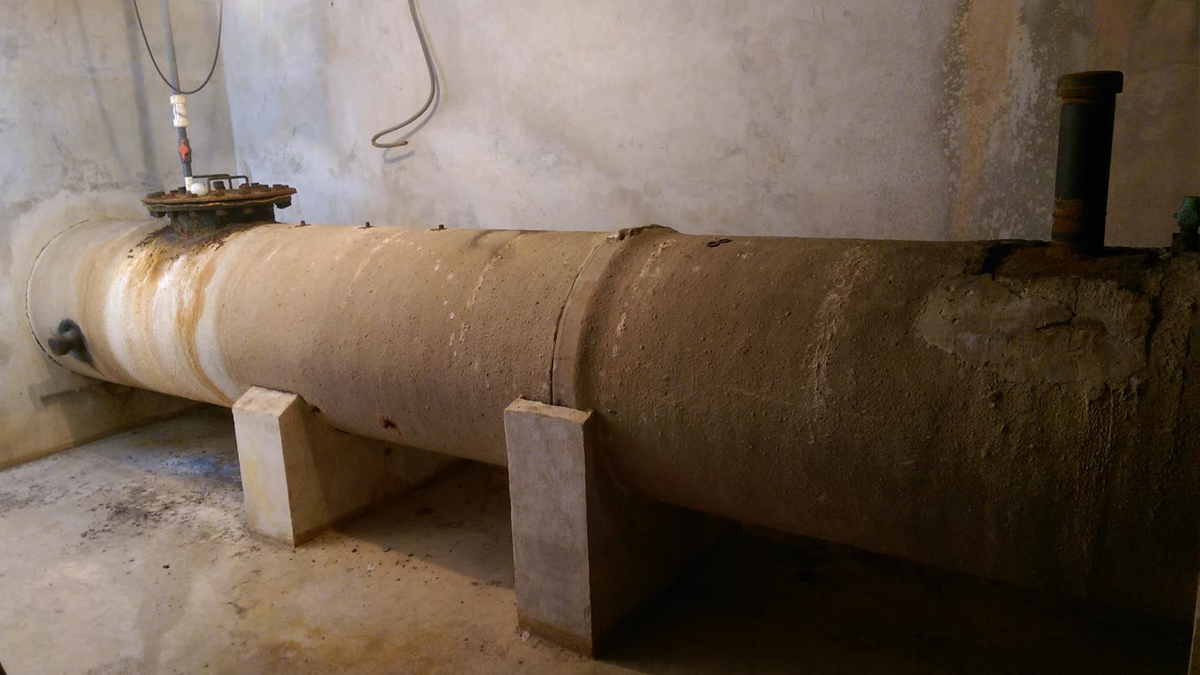Repairs consisted of removing the pipe supports for the carbon fiber installation to fully confine the repair system to the pipe. Temporary supports were formed, poured and put in place by the team. Due to the high level of corrosion, leaks occurred during surface preparation. STRUCTURAL utilized wood dowels to plug the leaks. Although this risked significant delay in completion time, the pipes needed to be dry to the touch before the carbon fiber installation.