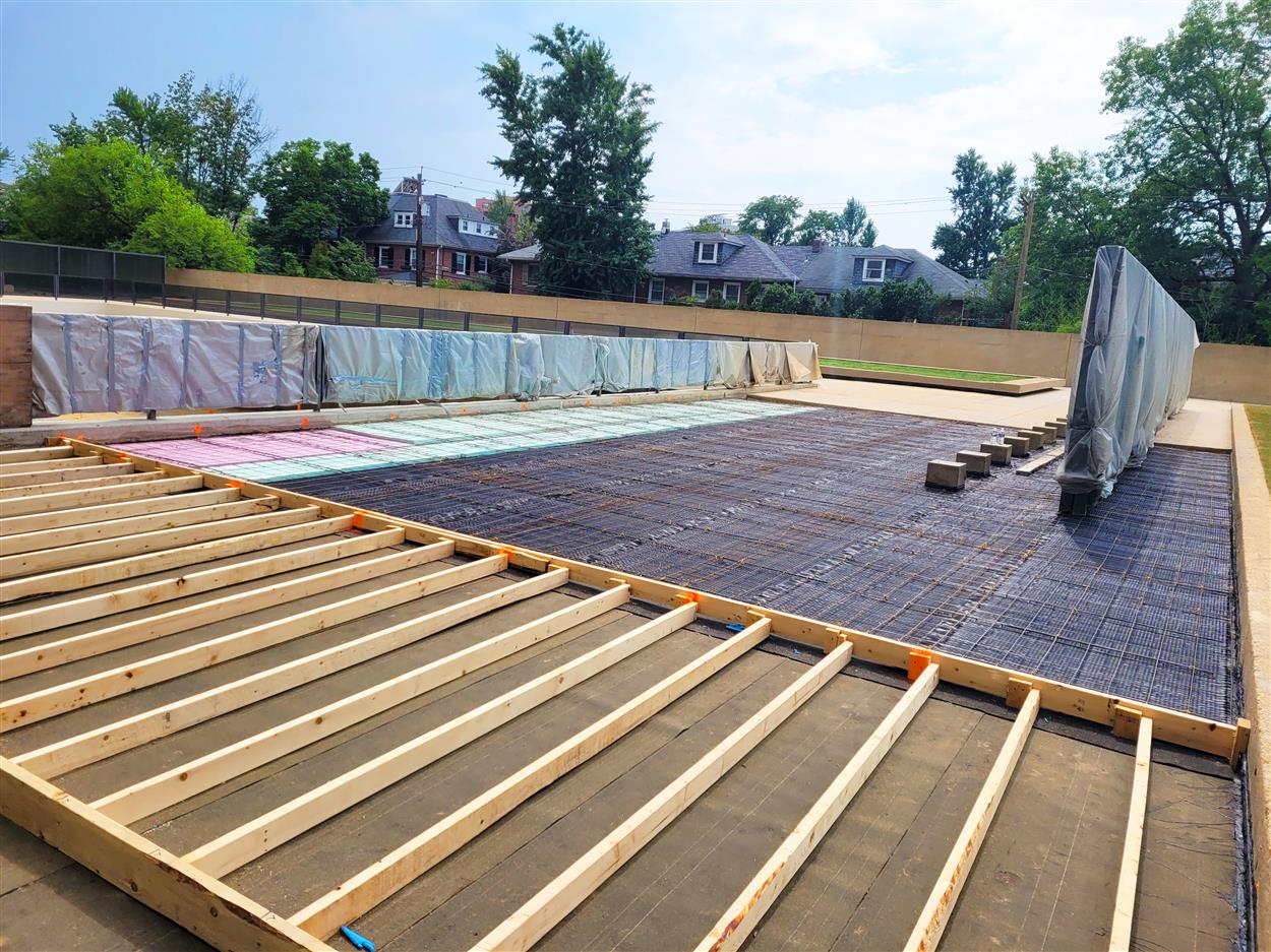 The Highfield House Plaza Restoration was completed over the span of 18-months. The team facilitated 46 different concrete placement days that involved placing over 853 cubic yards of integrally colored concrete with an exposed aggregate finish. The project was completed without any safety incidents.