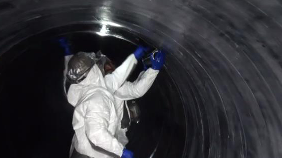 Upon entry into the designated pipe segments, surface preparation was the first step in the V-WrapTM installation process. Preparing the concrete and joint areas properly is critical for ensuring water tightness of the repair, as well as ensuring the long-term performance of the pipeline upgrade. The carbon fiber fabric was then conveyed through the saturation machine which displaces the appropriate amount of epoxy into the fabric. Once the fabric was properly saturated, it was then lowered into the pipe for installation.
