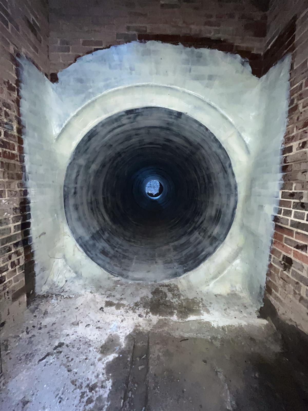 STRUCTURAL, an exclusive licensee of STRUCTURAL TECHNOLOGIES, performed the repairs. The initial phase involved debris removal from the tunnel and pipes, followed by the application of STRUCTURAL TECHNOLOGIES’ StrongPIPE® V-Wrap™ Carbon Fiber System to reinforce the pipes and mitigate future damage from potential groundwater infiltration. The second phase focused on repairing the brick vaults, which were also reinforced with the V-Wrap™ system.