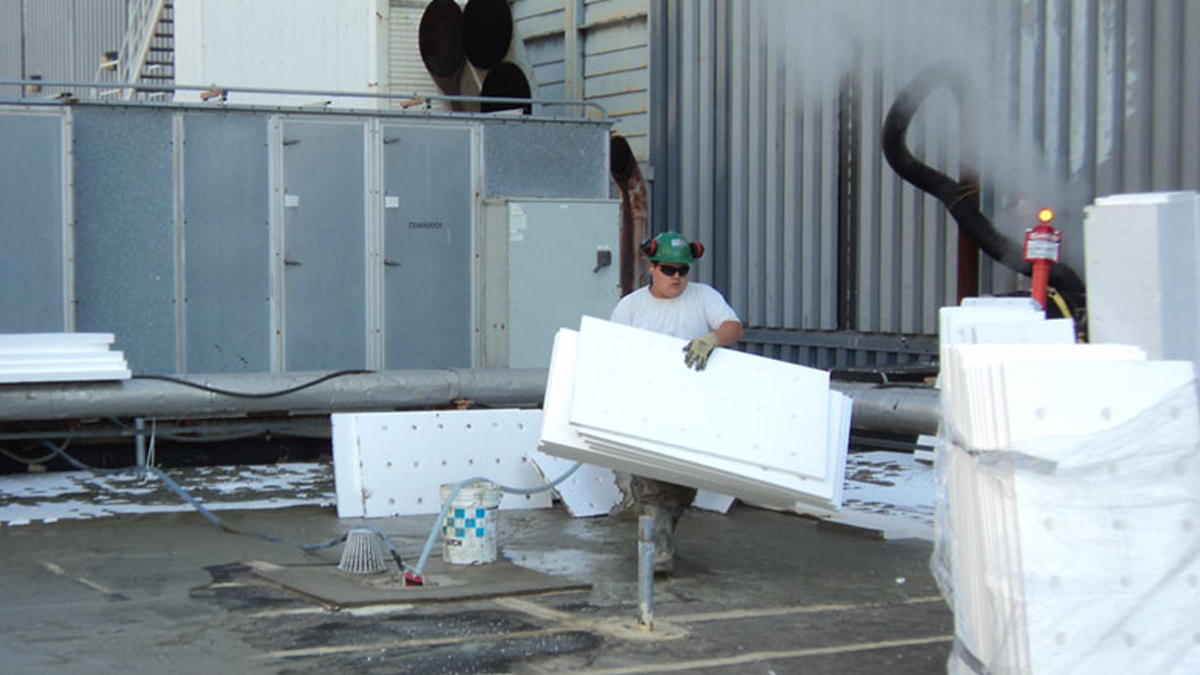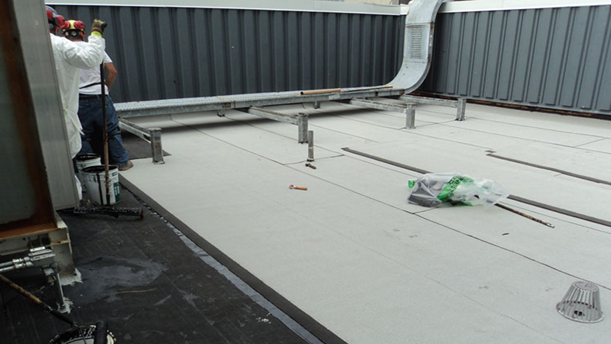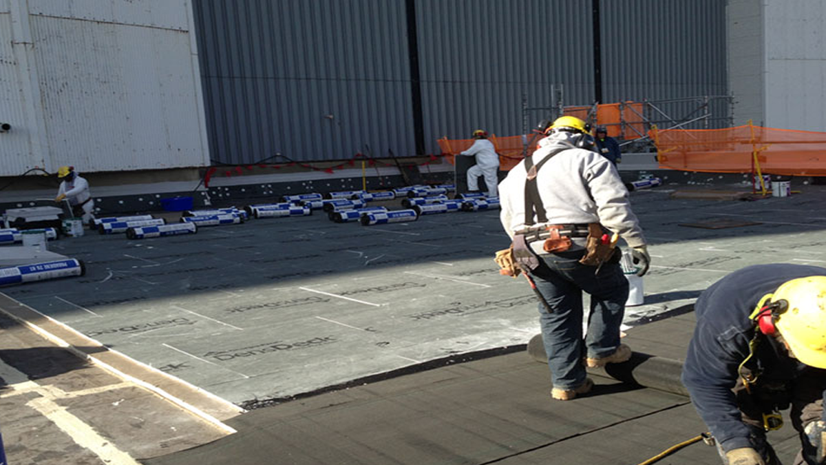 STRUCTURAL worked closely with the client to provide a full mock-up in-house to demonstrate the repair process and how to address more than 30 details found on the various roofs. After the details of the project were fully planned out, STRUCTURAL began to install the BUR system. Crews first removed the existing roofing, which measured up to 15 inches thick in some areas. Special precautions were made to ensure that the workers could safely perform work without cutting or drilling into embedded live conduits that may have been installed in the high flutes of the sheet metal deck pans.