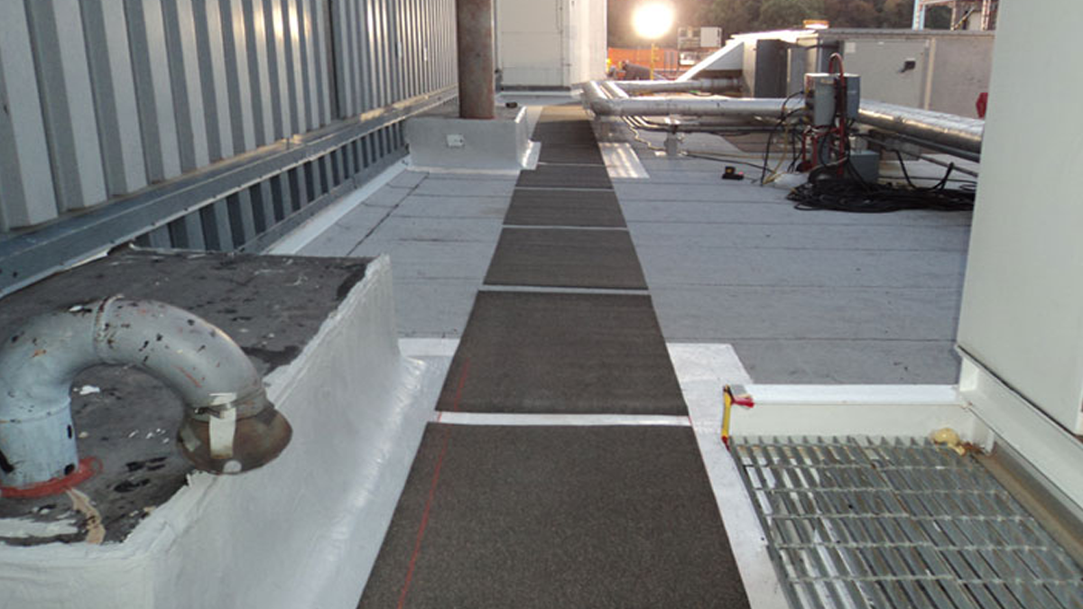 Non-critical roofs were categorized based on the amount of foot traffic. Those with more foot traffic were determined to need a BUR system with two plies of mod-bit with a layer of mod-bit vapor barrier and a fiberglass-covered gypsum board beneath. For the roofs with little foot traffic, the repair strategy included a single-ply PVC roof membrane on top of a roof board.