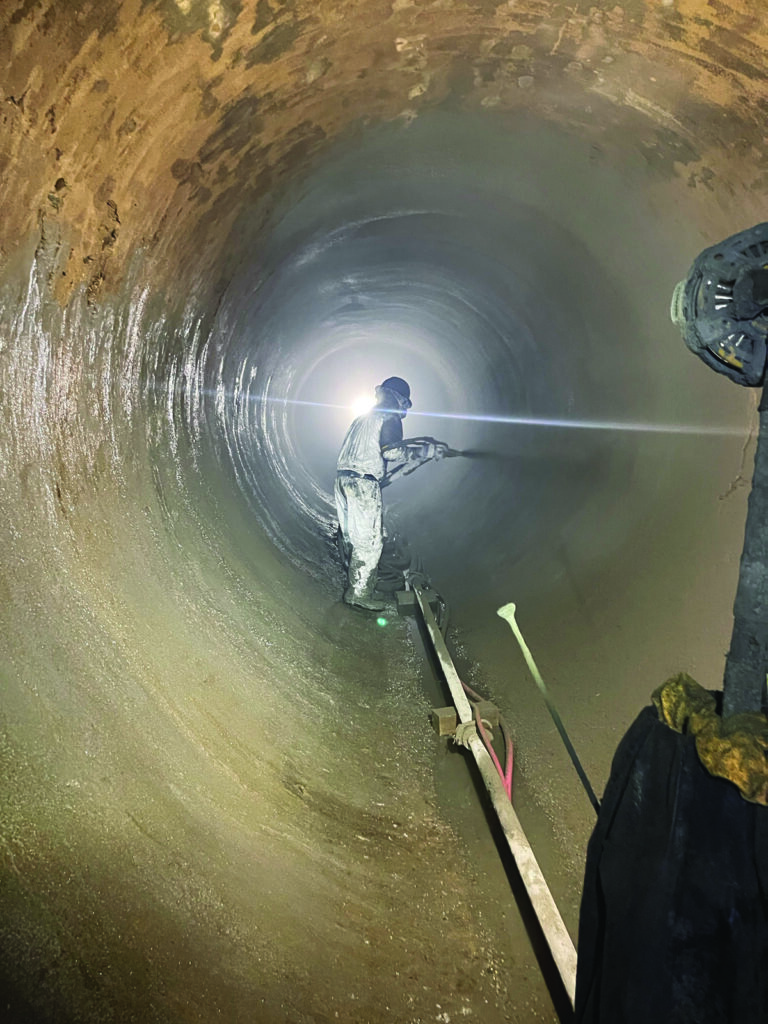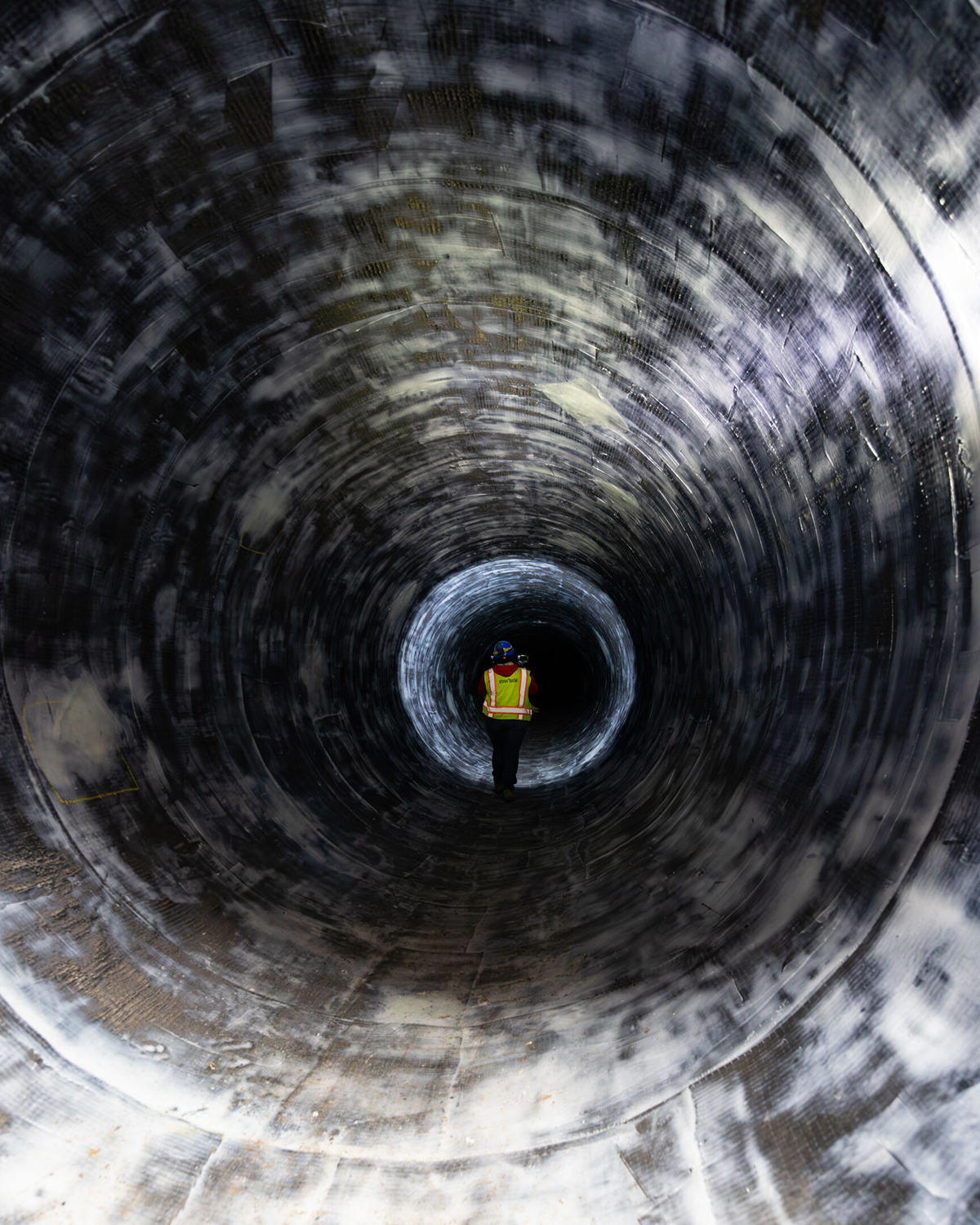 Most of the pipeline was reinforced using a 2.5-inch unreinforced shotcrete liner. For the more deteriorated 300-foot section, six layers of STRUCTURAL TECHNOLOGIES’ StrongPIPE® V-Wrap™ Carbon Fiber System were installed. This advanced trenchless solution not only reinforced the pipeline but also extended its service life by over 50 years while accommodating the pipeline’s non-linear alignment and variable diameter.