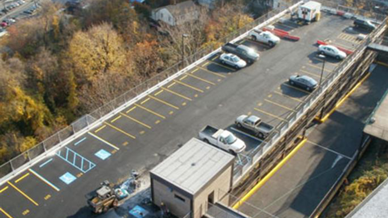 To address the challenges of the project, a plan was developed that included demolition and replacement of nearly 100,000 square feet of concrete, and the installation of new structural steel framing, traffic bearing waterproof membrane, sheet membrane waterproofing and asphalt. Additional work items included plumbing, masonry repairs at the stair tower, painting all steel members and the installation of new floor drains, fencing, guardrails, lighting and electrical work.