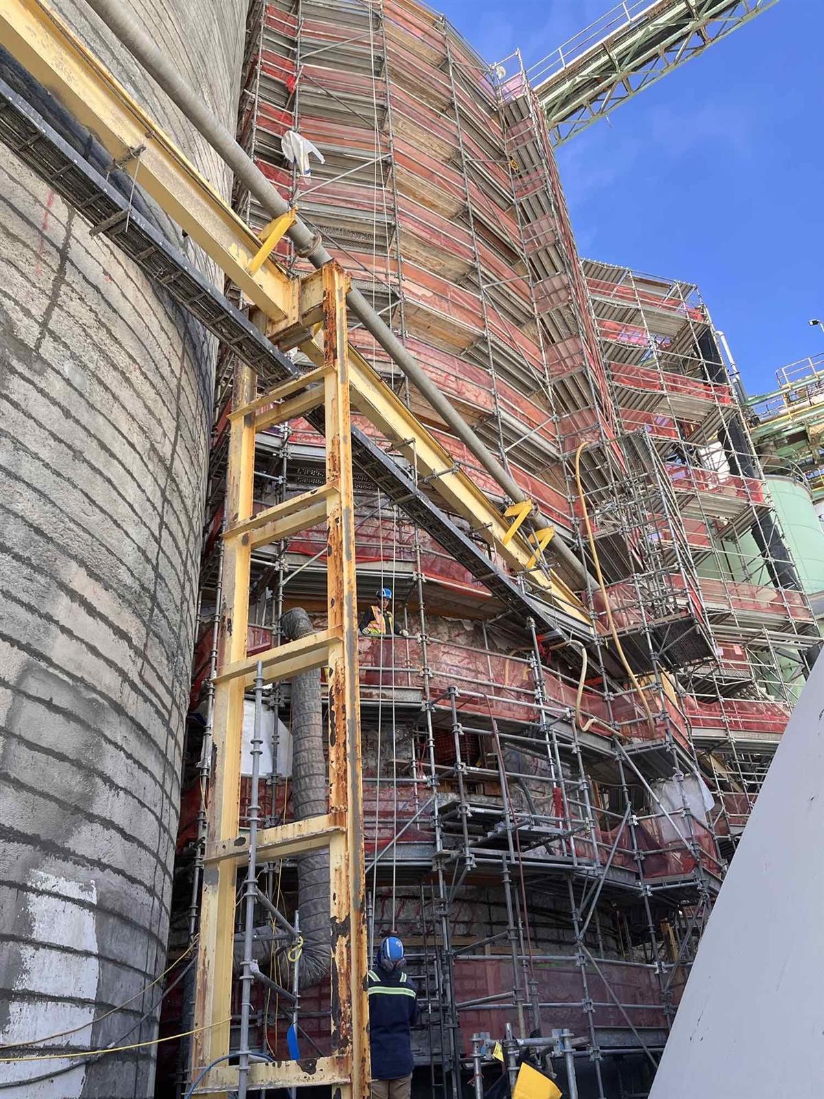 STRUCTURAL TECHNOLOGIES worked with their licensed contractor, STRUCTURAL, to implement a turnkey Investigate-Design-Build (IDB) repair approach. Starting with the design, STRUCTURAL TECHNOLOGIES engineered a solution with special attention to constructability concerns like phasing, shoring, coordinating with Owner operations, and safety strategies. The final design allowed a phased repair approach to keep adjacent silos to those being repaired in operation, eliminating major loss of production and revenue.