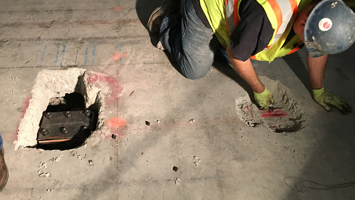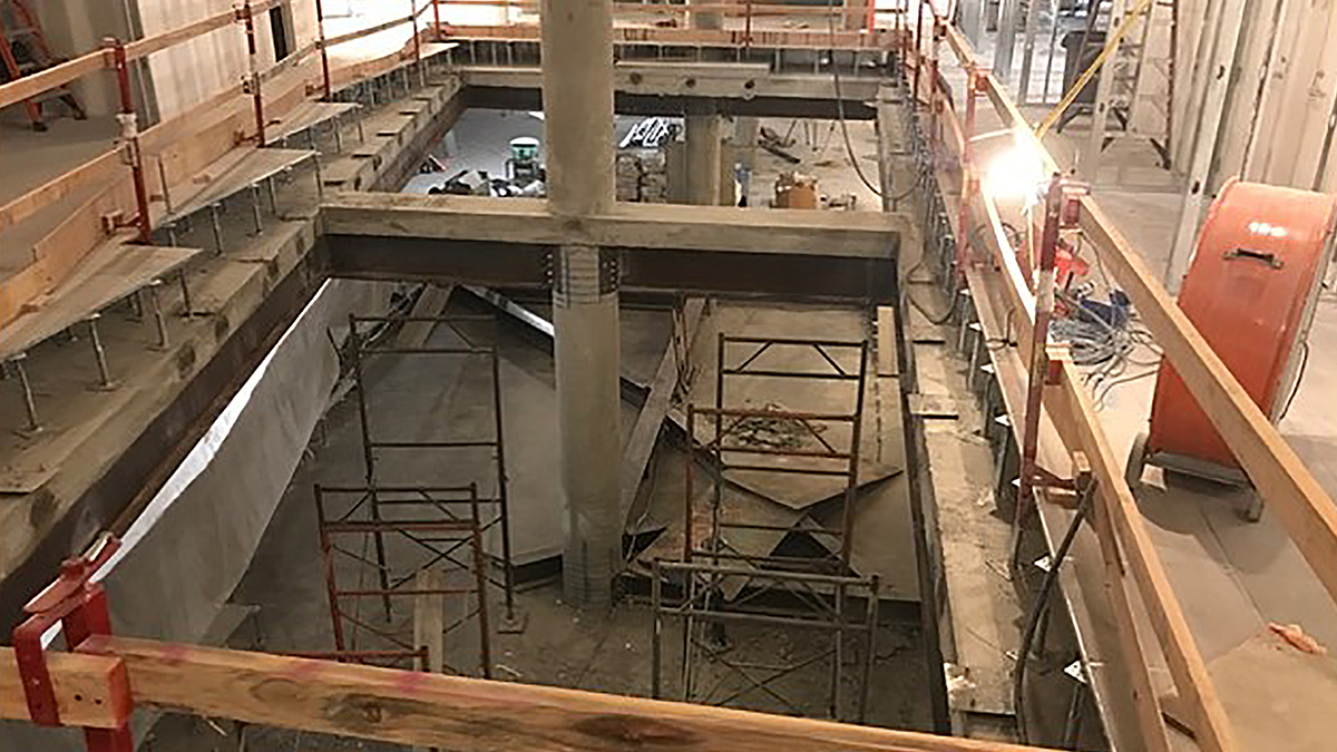 Construction activities began with radiography (x-ray) to identify precise tendon locations and depth. Following the confirmation of tendon locations, a structural steel support system was installed around the perimeter of the future opening, and CFRP system were installed within the area of deficient negative moment reinforcing. Additionally, shoring frames and a support platform were installed below the slab opening.