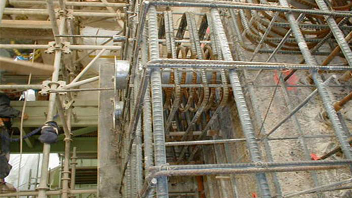 This solution was quite extraordinary, as it required precision-drilling horizontal holes up to 87 feet long in the beams of the elevated frame structure, without cutting existing embedded reinforcement. Nondestructive impulse radar testing was used to locate existing embedded reinforcing steel, as well as to monitor the trajectory of the drilled hole. This process helped ensure proper tendon alignment and prevent damage to embedded steel.
