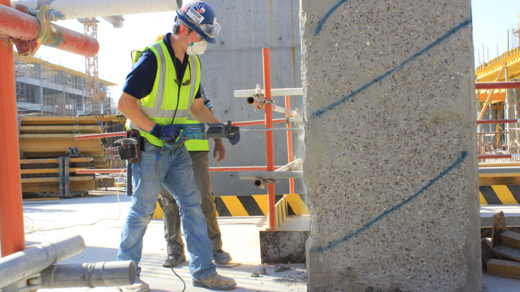 The scale of the project required over 250 repair technicians from over 5 countries to complete the scope of repairs. Local labor crews were added and given comprehensive training to ensure quality and safety practices were maintained throughout the job. Fire damaged concrete was removed with small electric and pneumatic chipping hammers. These small sized hammers were used in order to prevent micro-cracking of the substrate. Once the removal of the fire damaged concrete was completed, direct tension bond tests were performed to verify that the damaged concrete was fully removed. Localized repairs were categorized to understand the levels of damage and the best repair solution. For vertical surfaces, such as columns and walls, traditional form and pump techniques were utilized. For horizontal elements, such as soffits and the underside of the slab, repairs depended on how deep the deterioration infiltrated the structure. If the deterioration did not reach the rebar, shotcrete was the repair approach, but if the deterioration did reach the rebar, traditional form and pump techniques were again utilized. To repair the top slab, the form and pour method was used. Hand placement was used to repair small areas as needed.