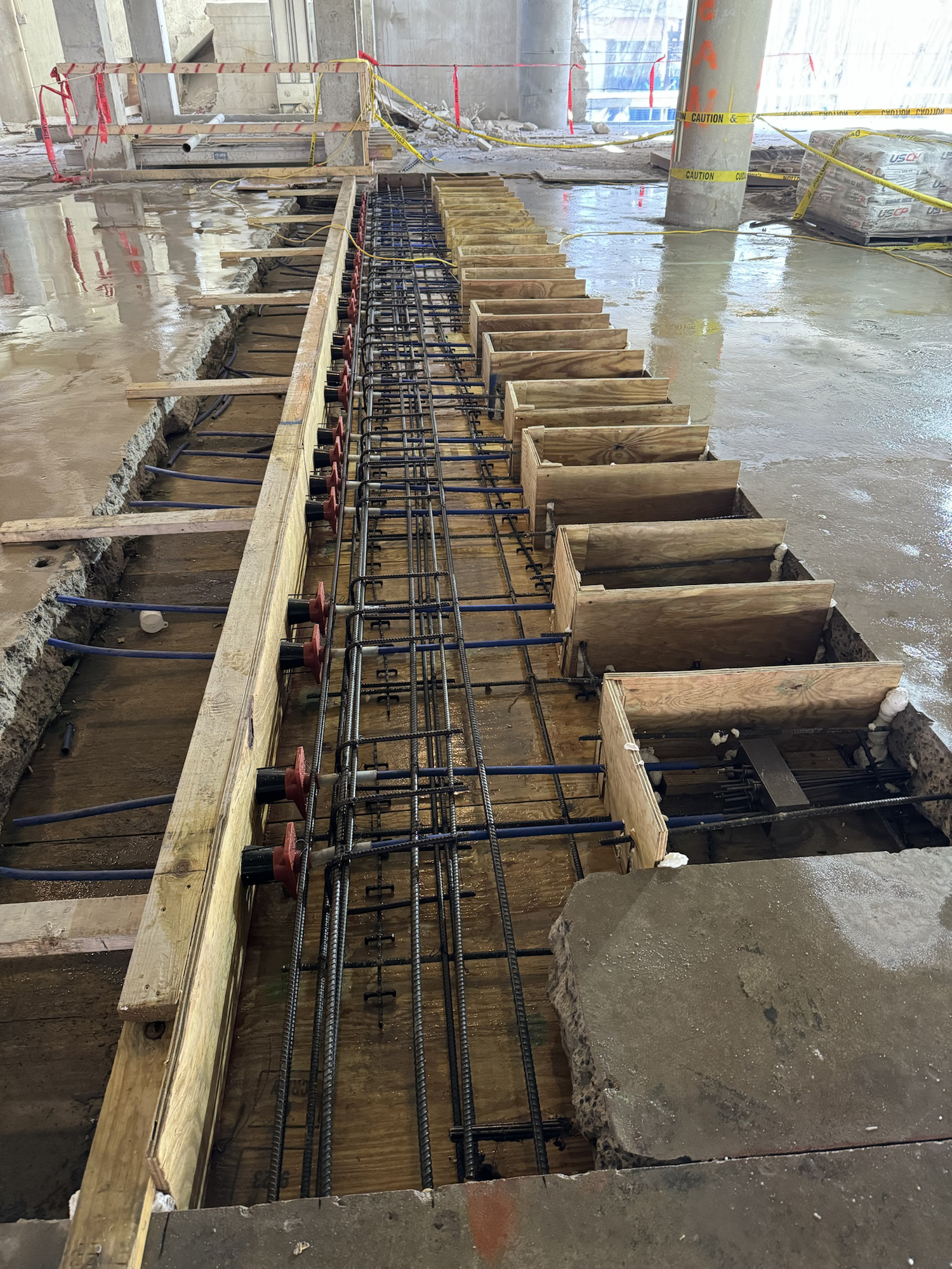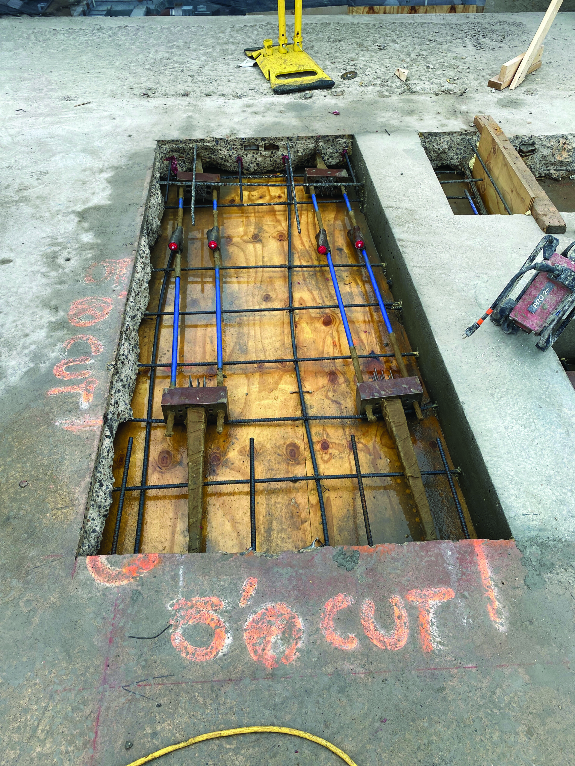 One of the most complex challenges involved demolishing the original building core. This required de-tensioning and re-anchoring 18 post-tensioning tendons. Because the existing button head post-tensioning system was outdated, custom conversion blocks were designed to adapt it to modern anchoring methods.