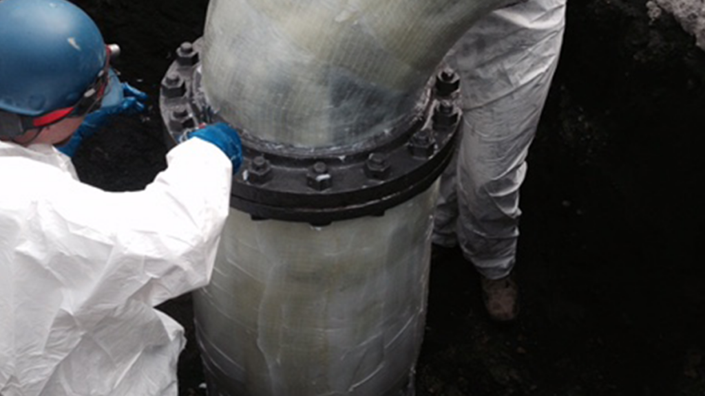 The existing soil was excavated to identify the extent of the vertical cracks on the pipe which were sealed with hydraulic cement. A moisture tolerant epoxy mortar was installed to create a slope over the flange area. Using the V-Wrap CFRP™ system, the piping was wrapped. Stainless-steel clamps were fastened for additional strengthening and new surrounding concrete was formed.