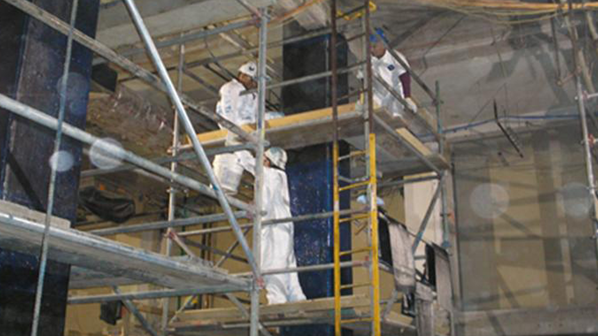 Traditional methods for strengthening columns involve steel and concrete in the form of an enlarged external jacket around the column. This method must be performed monolithically with the column to provide resistance to higher buckling forces and in this case would have increased the overall column size – making the egress width of the new corridor below code. Instead, the team chose to use CFRP – bonding it to the columns with epoxy adhesive in both horizontal hoop and continuous vertical sheets. While adding less than one inch to the column size, they effectively upgrade the column for both buckling and current load carrying capacity codes.