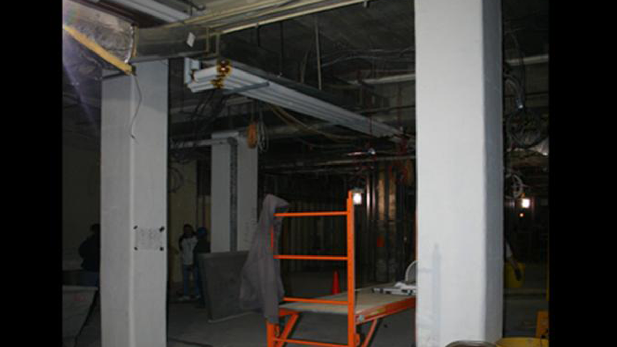 Creating this connection was the final phase of the project, but it presented unique challenges. Because the two towers were at different elevations, it was necessary to build the concourse on an incline. Building on the incline, however, meant that the existing intermediate slab had to be removed in order for the concourse to pass through the lower elevation to the higher one. The removal would double the unsupported length and could cause the columns supporting the original building loads to buckle. The columns, as well as two other areas, a steam tunnel and the Grease Recovery Unit Room (GRU), also had to be repaired and/or strengthened before the new concourse could be completed.