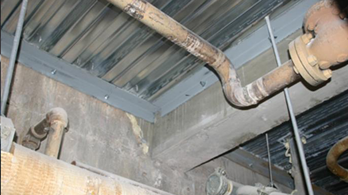 Repairing the below sea-level room that contained the GRU proved to be a challenge. The concrete ceiling and three very large columns in the room had deteriorated to a point of structural concern. Once the original ceiling structure was removed, formwork was placed and a new two-way slab and beam system was cast with new hangers and supports for the piping and the equipment. Reinforced enlarged sections were added to repair and strengthen the columns.