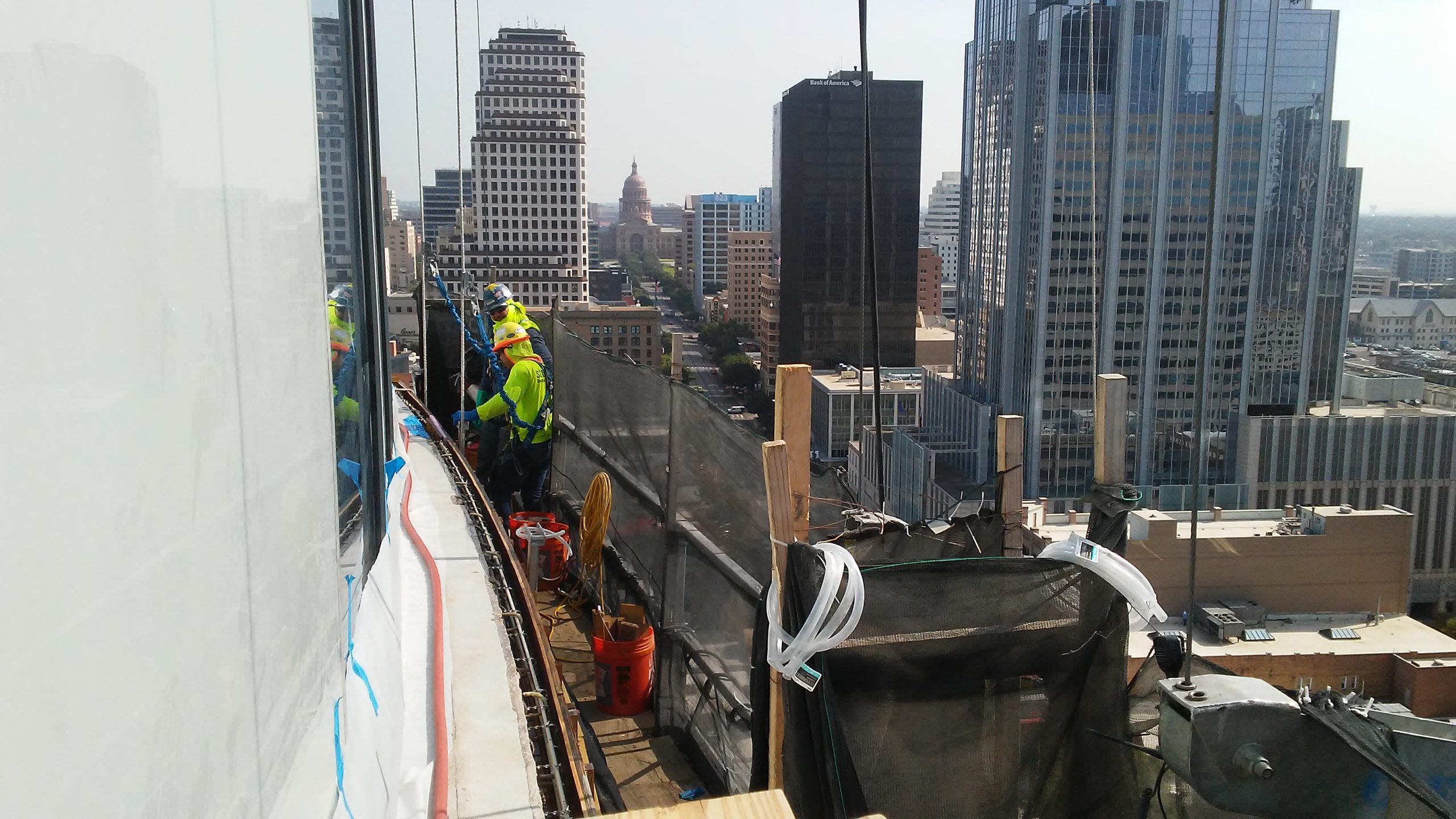 As one of the tallest buildings in Austin, safely accessing and completing the work via swing-stages was a challenge that the team had to overcome. In order to keep everyone safe, the team created a safety plan for working at extreme heights over a busy metropolitan area, and a 100% tool tie off and dropped object protection plan was used to mitigate the risk of dropped objects. The crew also created a sidewalk bridging system around the building that didn’t interfere with pedestrian, vehicular or delivery truck traffic to add extra protection. Also, due to the shape of the building, wind could easily pick up speed around it, so the team set up a system to make sure team was safe around wind conditions hanging on swing stages.