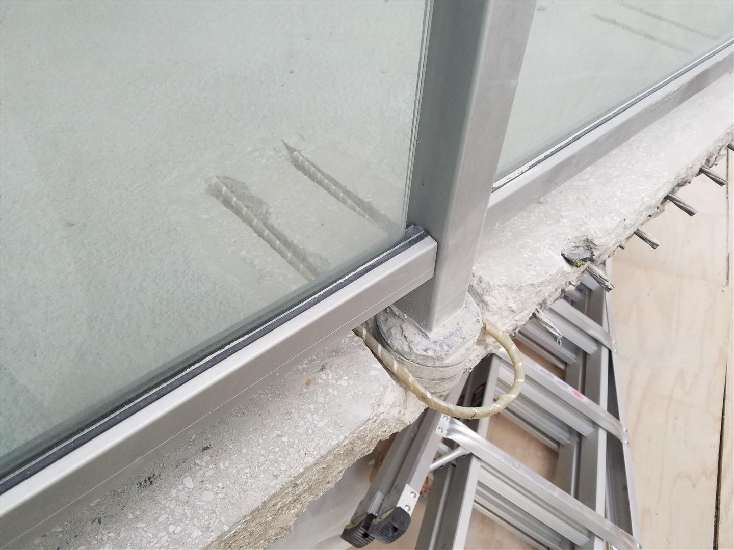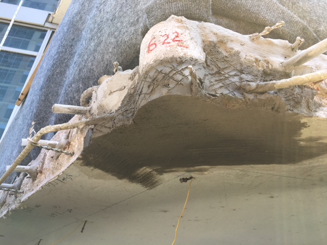 Six years after its original construction, a five-foot long concrete spall fell from a balcony edge and landed on the base of the building. Fortunately, no one was injured and there was minimal property damage. After the incident, an inspection was conducted and signs of distress were found around many areas around the balcony edges and eyebrows of the building. The investigation also found a misplaced bar in the slab had created a low cover condition that led to delamination spall for much of the buildings slab edges. To mitigate the risk of falling hazards, numerous temporary protective measures, such as steel plating anchored to deteriorated slab edges, were put in place to secure the delaminated concrete until a permanent solution was installed.